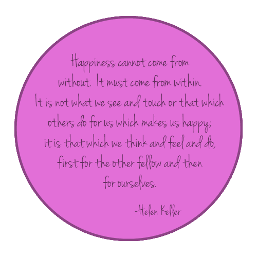 Happiness cannot come from without. It must come from within. It is not what we see and touch or that which others do for us which makes up happy; it is that which we think and feel and do, first for the other fellow and then for ourselves. - Helen Keller